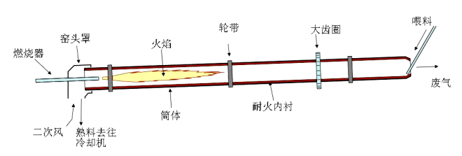 6、燃燒系統,包括噴煤管、鼓風機等,燃燒燃料,為窯系統對物料的熱加工提供熱源。